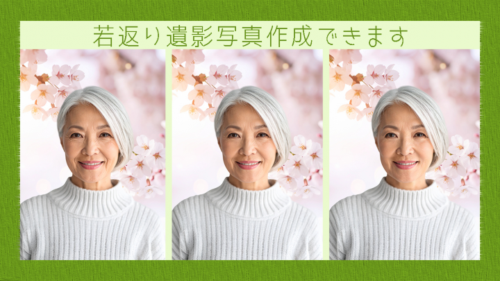 遺影写真作成|横浜市青葉区・川崎市宮前区の写真のモリタ【背景修正・当日仕上げ対応】古い写真やスマホのデータからでも、自然で美しい遺影写真をお作りします。色あせやキズの補修、背景変更、衣装の着せ替えも対応可能です。ご家族の大切な一枚を、心を込めて仕上げます。お急ぎの場合でもご安心ください。お通夜・告別式前の急なご依頼にも対応いたします。背景消し・差し替え衣装着せ替え傾き・姿勢補正スマホ転送データ保存用データ