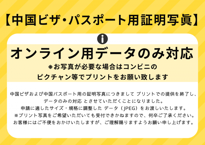 【中国ビザ取得写真】 ◇縦4.8cm X 横3.3cm◇6ヶ月以内に撮影された正面を向いたカラー写真◇背景真っ白◇写真の上から頭頂までは3mmから5mm、写真の下から顎の先までは7mm以上◇顔の大きさは頭頂から顎の先までが2.8cmから3.3cm以内◇顔幅は耳を含まずに1.5cmから2.2cm◇口は閉じて、髪は目や眉毛にかからない、被り物やアクセサリーは装着しない